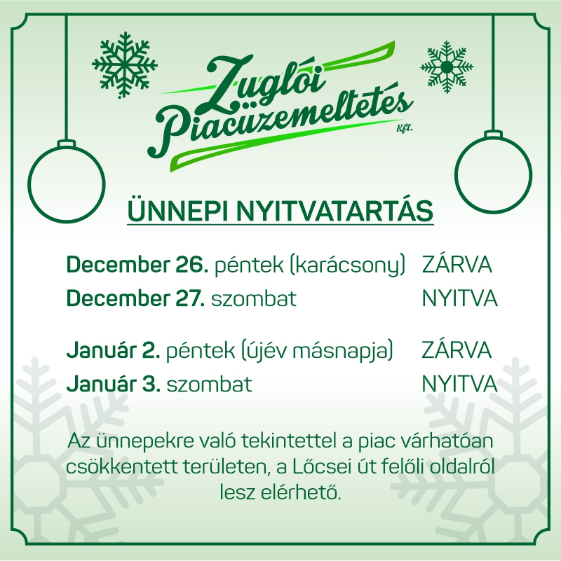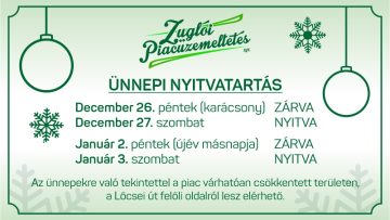 December 26. péntek (karácsony) - ZÁRVA December 27. szombat - NYITVA Január 2. péntek (újév másnapja) -...